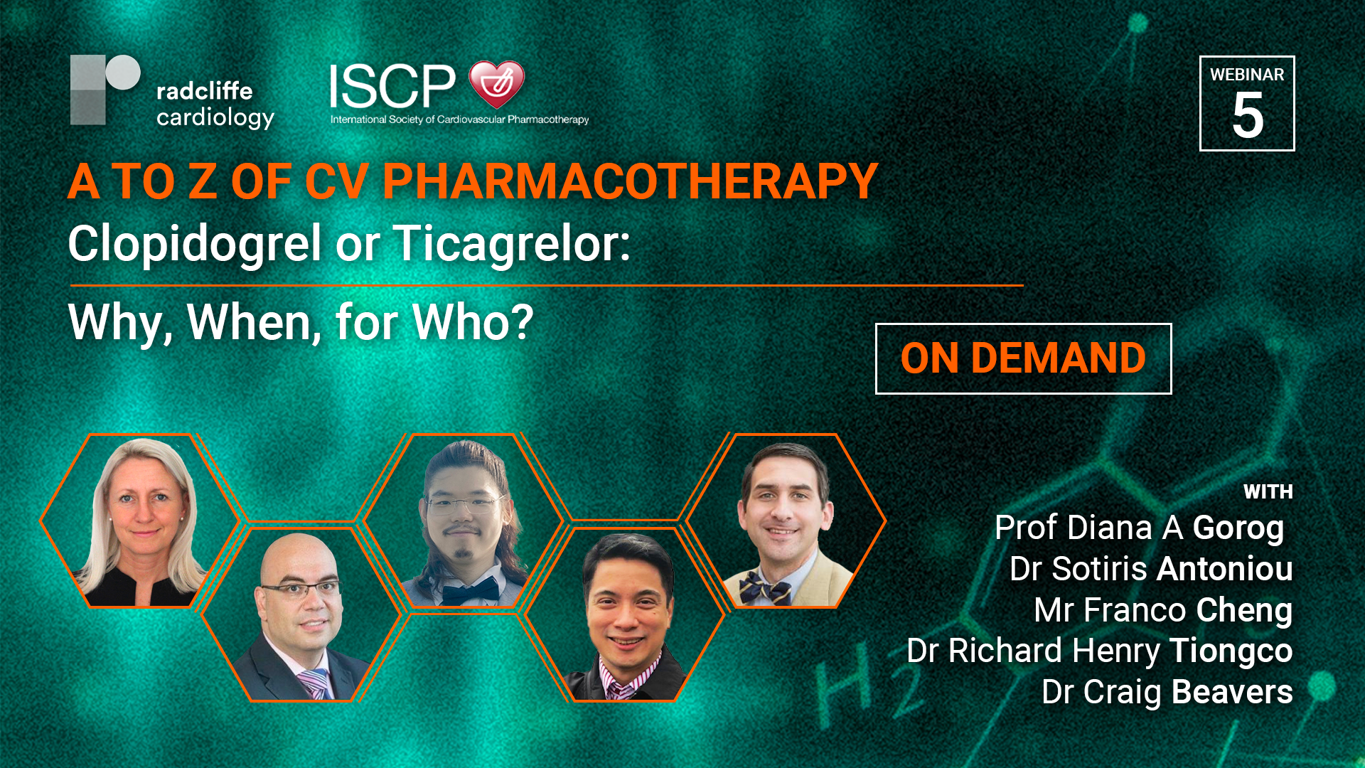 Led by moderators Craig Beavers (USA) and Franco Cheng (Hong Kong), it includes a speaker presentation from Diana A Gorog (UK) and a discussion from panellist Sotiris Antoniou (UK) that will examine the difference between two widely used P2Y12 inhibitors, clopidogrel and ticagrelor, through consideration of real-world examples, live discussions and audience Q&A.